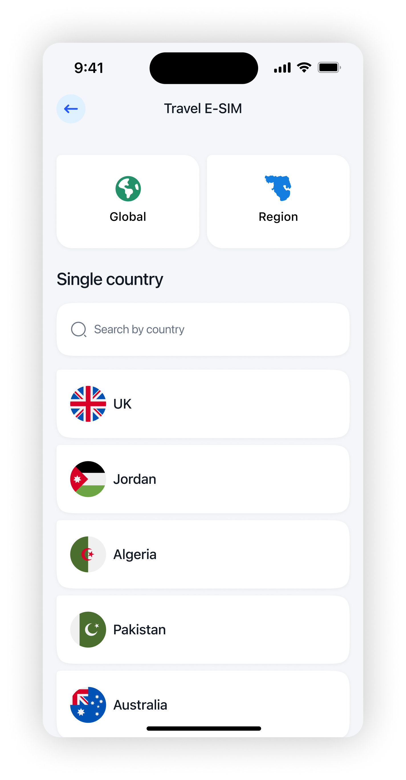Upon selecting Travel E-SIM, the user is taken to a page where they can choose between Global, Regional, or Single Country E-SIMs based on their destination
